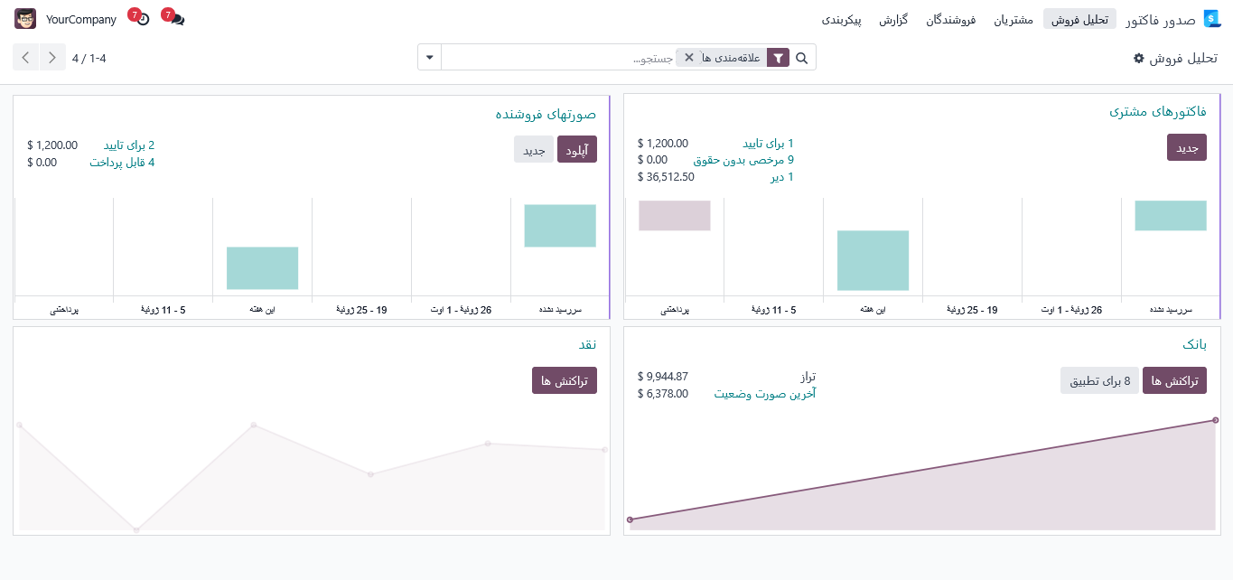 Odoo برای رسیدگی به نیازهای کشور شما از پیش پیکربندی شده است: نمودار حسابها، مالیات، گزارشهای خاص کشور، صورتحساب الکترونیکی، فایلهای حسابرسی، و موقعیتهای مالی برای اعمال خودکار نرخها و حسابهای مالیاتی مناسب.